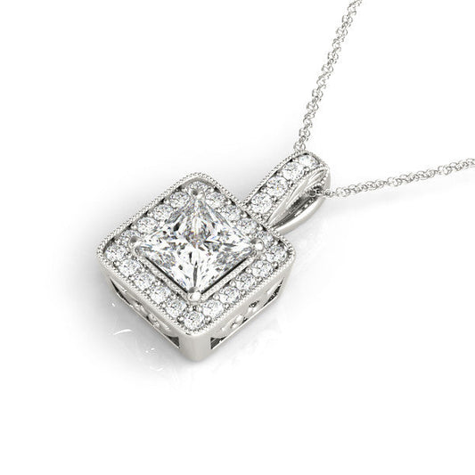 14K White Gold Princess Cut Diamond Halo Pendant With Milgrain Accents (1.25ctw)